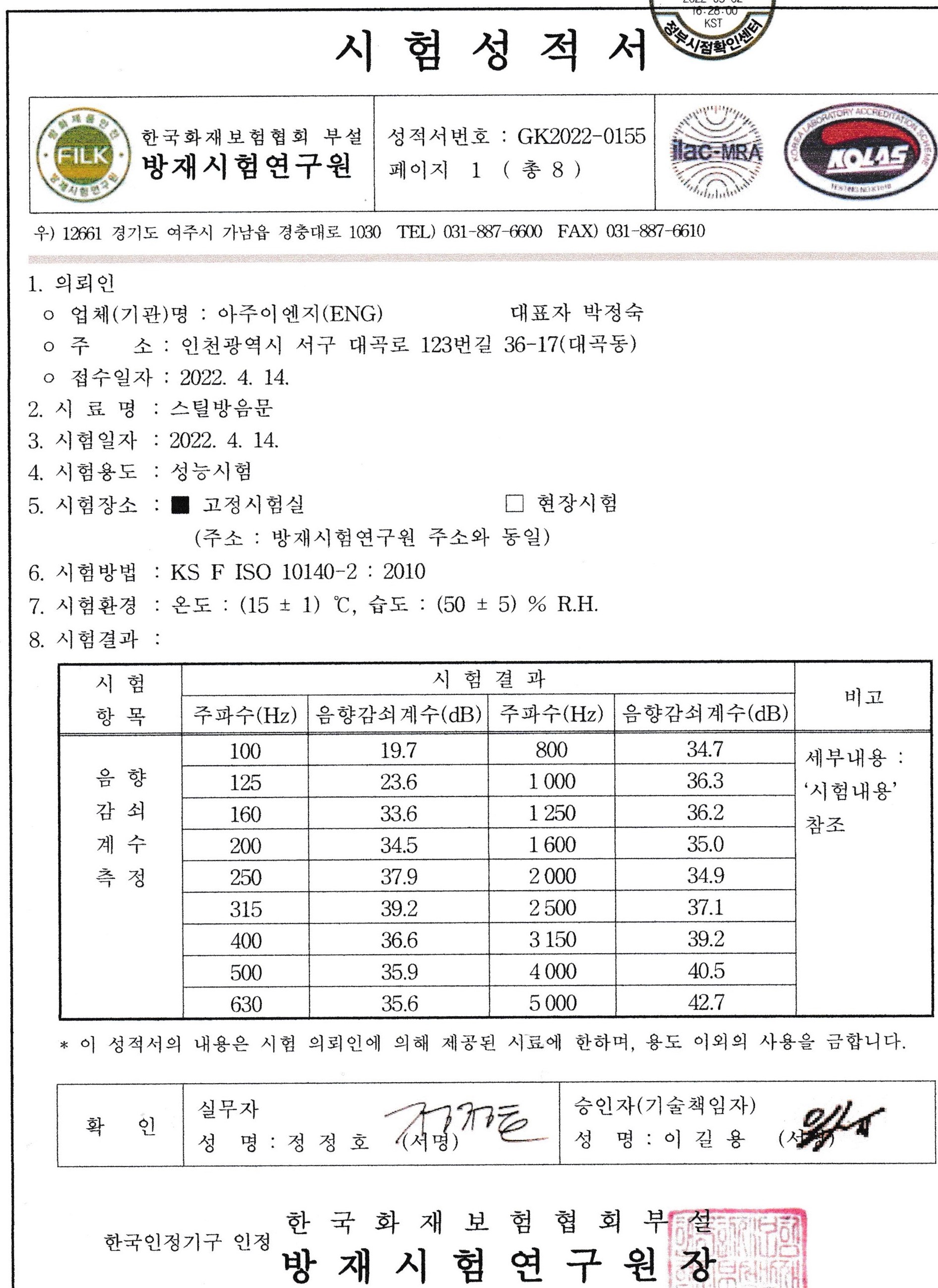 방음문 시험성적서 (시험일자 2022.04.14 )